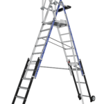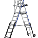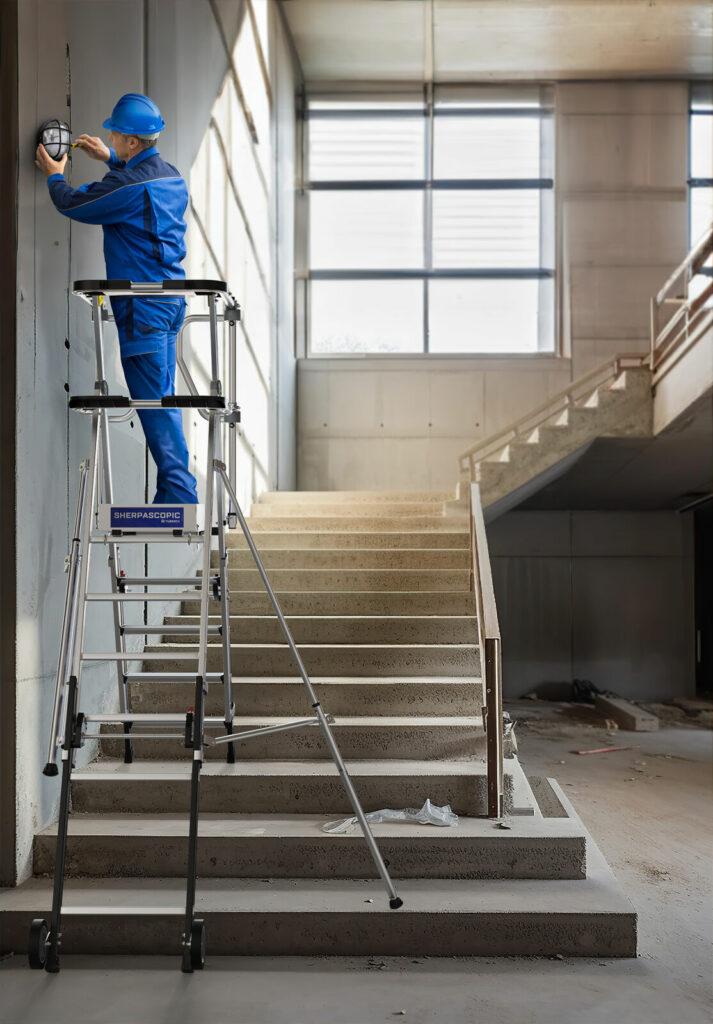 The SHERPASCOPIC SALOON GUARDRAIL Aluminium Industrial Telescopic Podium Step revolutionises industrial workspaces by blending unparalleled safety with unmatched functionality. This innovative podium step boasts a 4-sided rigid guardrail, enhanced with a Saloon-style gate featuring an automatic closing mechanism for optimal operator safety. Its design includes telescopic surfaces for precise level offsetting and an intuitive, secure height adjustment system that allows for changes every 23cm, ensuring a perfectly tailored working height.For stability and safety, it features 80mm non-slip steps in the fixed section and 60mm non-slip steps in the telescopic section, accommodating various work requirements. The podium is equipped with a detachable compartmentalised tool holder, capable of holding up to 25kg, and integrated hooks for an additional 10kg, streamlining your workspace efficiency. The large 600 x 400mm non-slip aluminium platform, alongside an XL tray that supports up to 25kg, provides an exceptionally comfortable and ergonomic workspace.Additional enhancements include anti-lift floor hooks, retractable stabilisers with millimetric adjustment for stability on any terrain, all-terrain 175mm moving wheels for easy relocation, and high-safety covering footpads, making the SHERPASCOPIC SALOON GUARDRAIL a pinnacle of industrial safety and versatility.
